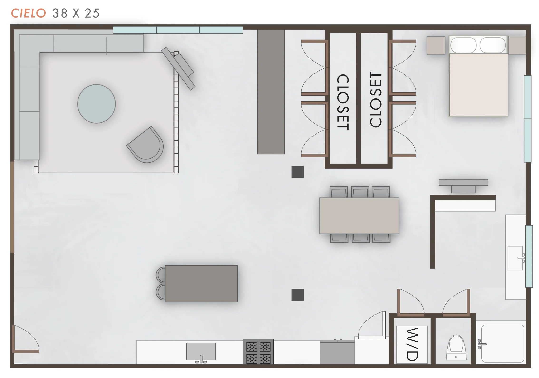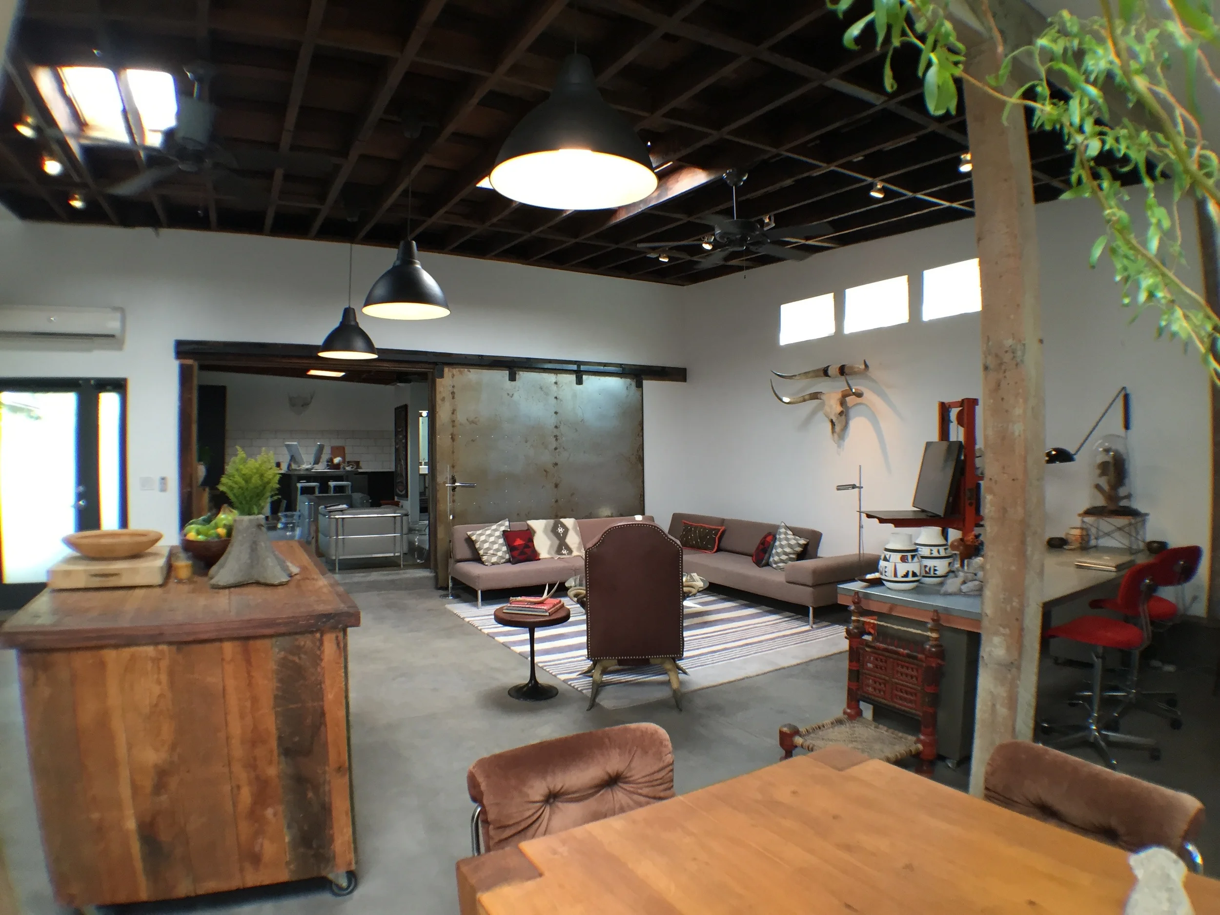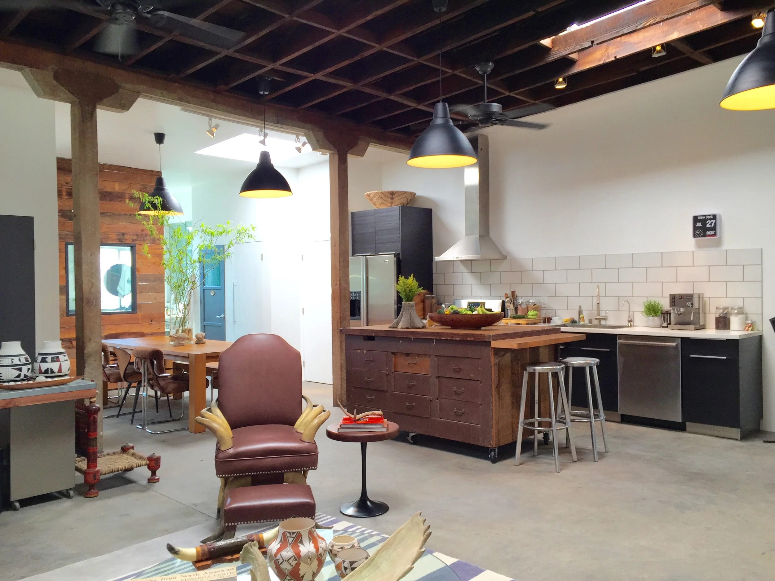 CIELO is the largest of all the lofts with a high ceiling and bright filtered light from the three large skylights. A large sliding barn door can be opened to create an adjoining suite with TIERRA if more space is desired. The main area has a large desk, dining table to seat 10, sectional sofa in the sitting area and a large kitchen with dishwasher. The bedroom has a full-size mattress, a large walk-in shower, and an open bathroom and dressing area. Accommodates 2 - 4 guests.
